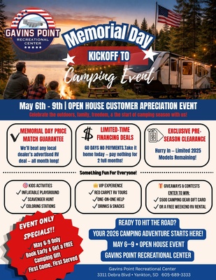 Your next adventure starts HERE! Join us May 6–9 for our Open House Customer Appreciation Event at Gavins Point Recreational Center and kick off camping season the right way.